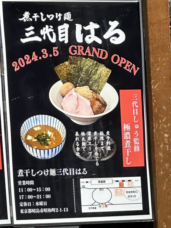 2024年3月30日、昭島の新店「煮干しつけ麺 三代目はる」へ。