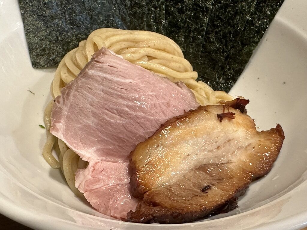 具は麺皿に炙りと低温調理のチャーシュー2種、小盛サービスの海苔。つけ汁にはきざみ青ねぎ・玉ねぎ。