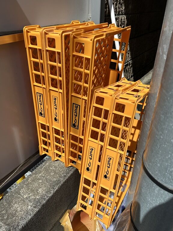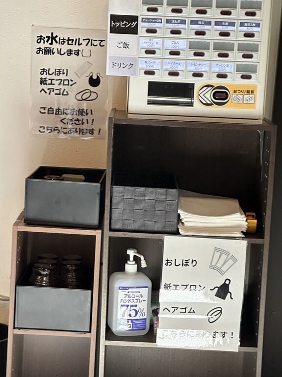 おしぼり・紙エプロン・ヘアゴムは券売機下にのカラーボックスに用意。