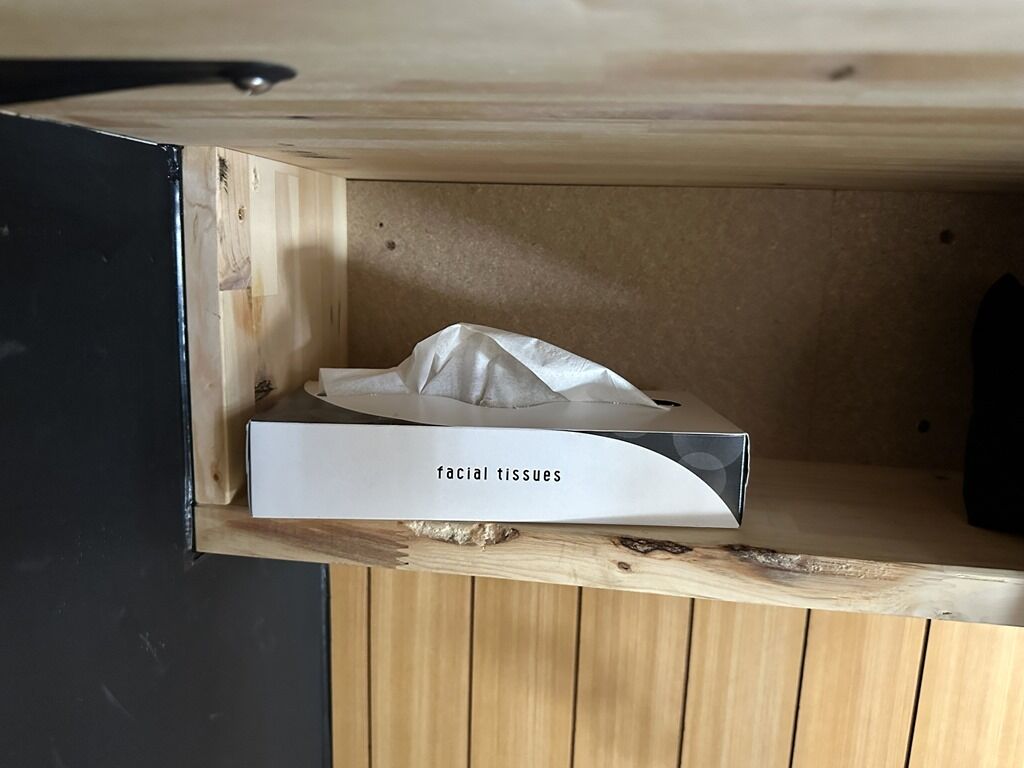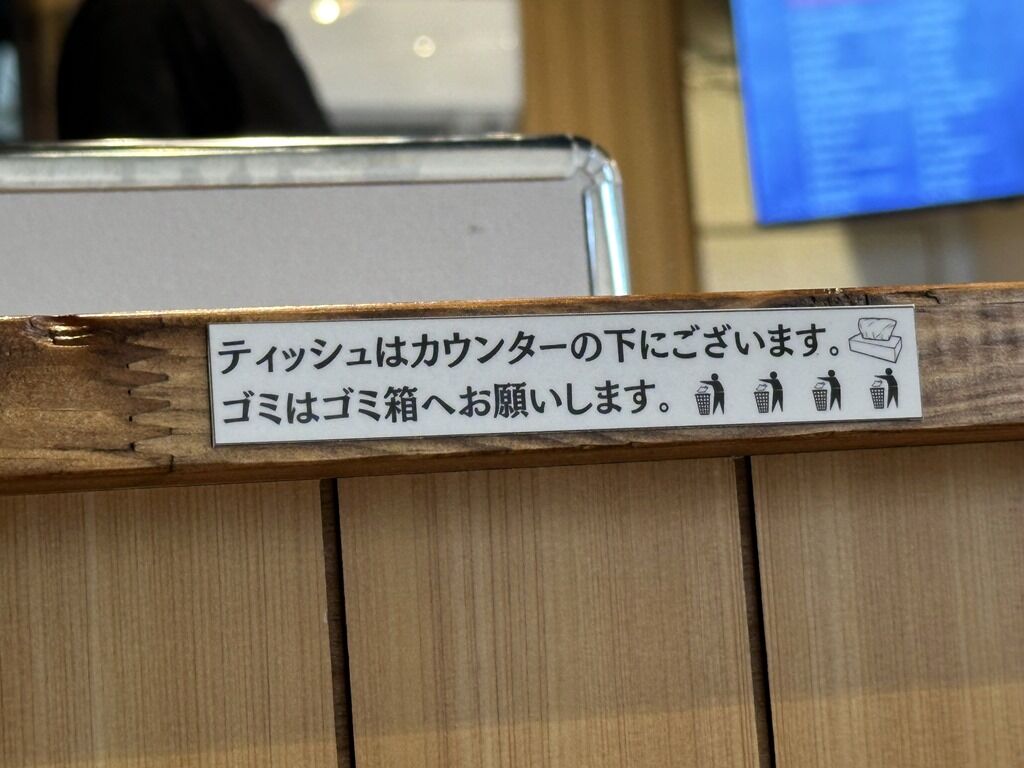店内は厨房を囲むL字型カウンター10席(7・3)。後客6名ほど。厨房には店主さんとサポートスタッフで計男性3名。箱テッシュはカウンター下の棚に。