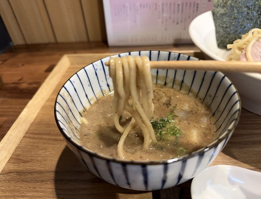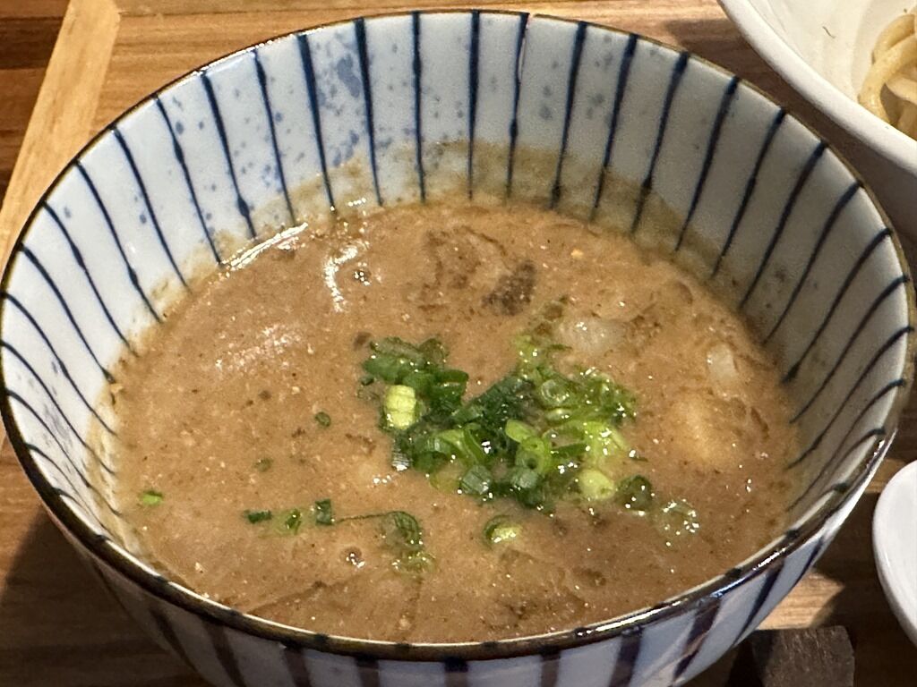 つけ汁はどろどろの豚骨魚介醤油味。豚骨ベースに大量の煮干を合わせたダブルスープ。ど濃厚ですがしょっぱ過ぎないちょうど良い調味。煮干しがガツンと効いて絶大なインパクト。