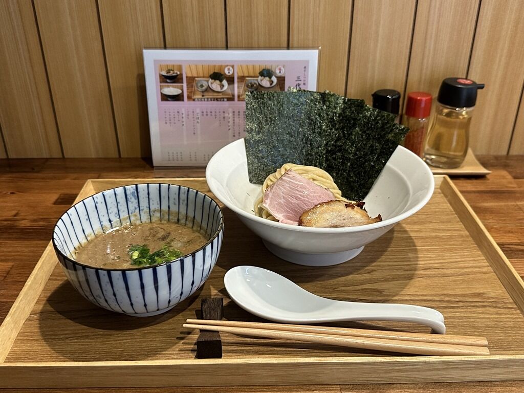 あらかじめ箸、レンゲがセッティングされた木製トレーの上に、つけ汁と麺が同時に着丼。