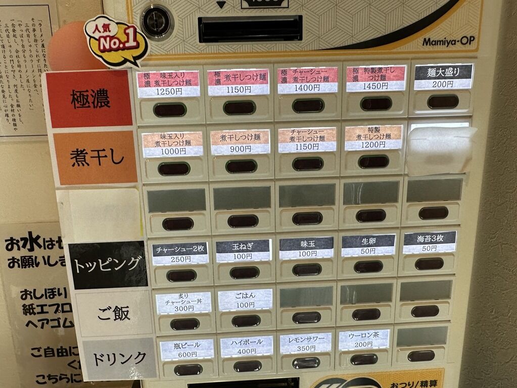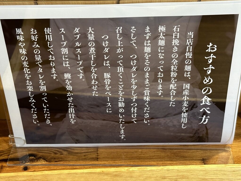 12:10頃到着で店内満席外待ち3。先に食券買ってから列ぶ方式。主なメニューは、極濃煮干しつけ麺1150円、煮干しつけ麺900円、炙りチャーシュー丼300円、他。