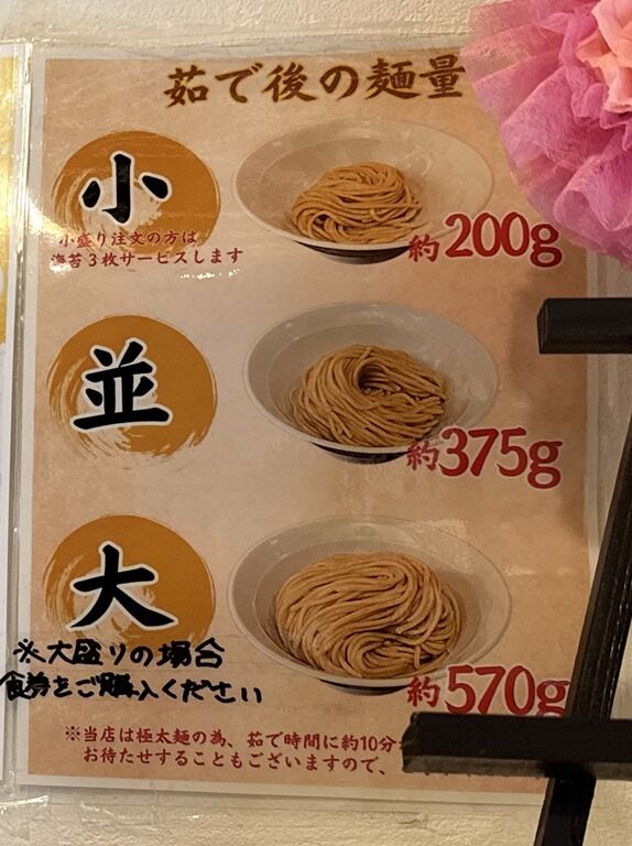 麺量はゆで後で、小200g、並375g、大570g+200円。小を指定すると海苔3枚サービス。