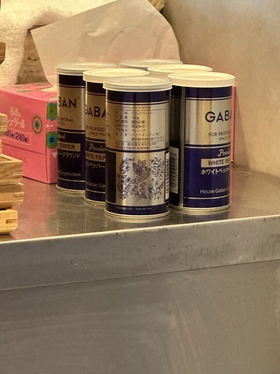 スタッフは厨房に店主さん?、ホール担当の男女合わせて3名体制。BGMはポップス。箸は割り箸。卓上調味料は無し。ですが、GABANホワイトペッパーがクローズ準備で既に回収済みな感じに。