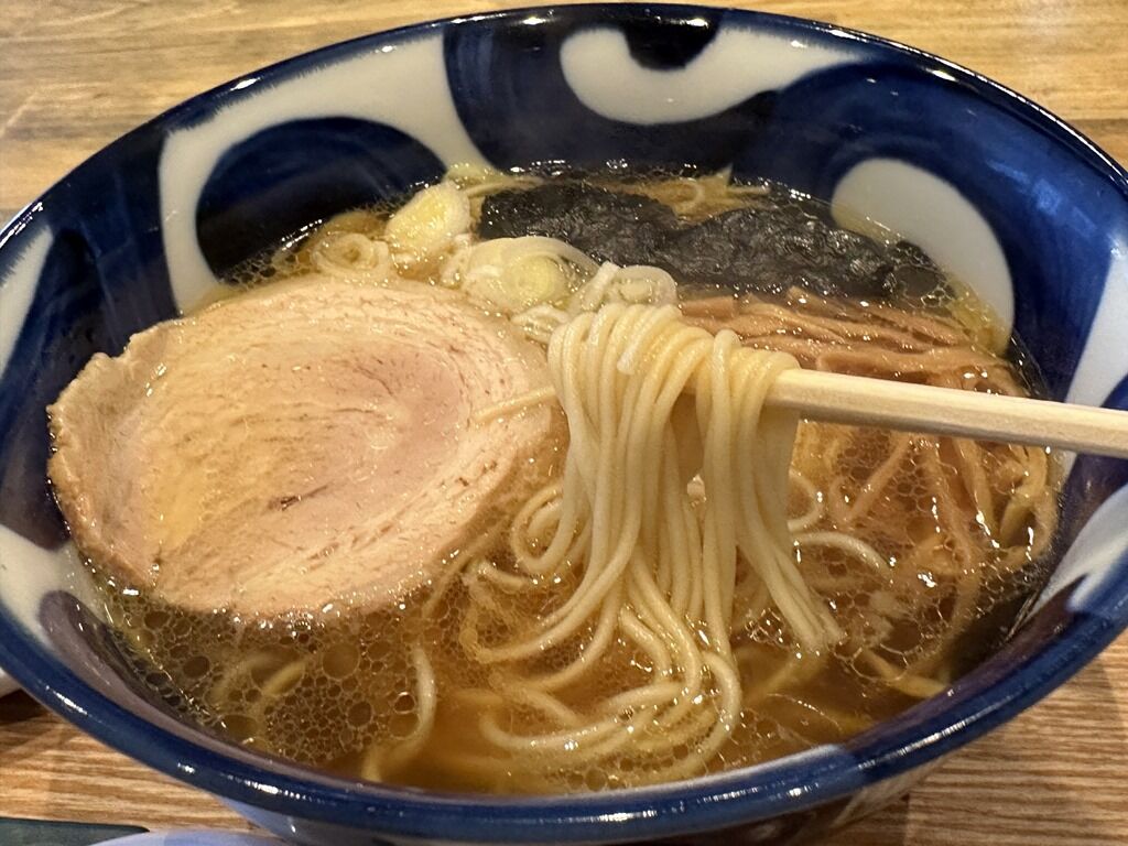 麺はストレート中細タイプ。しっかりとゆで切ってあって柔らかな食感。優しいスープと好相性です。