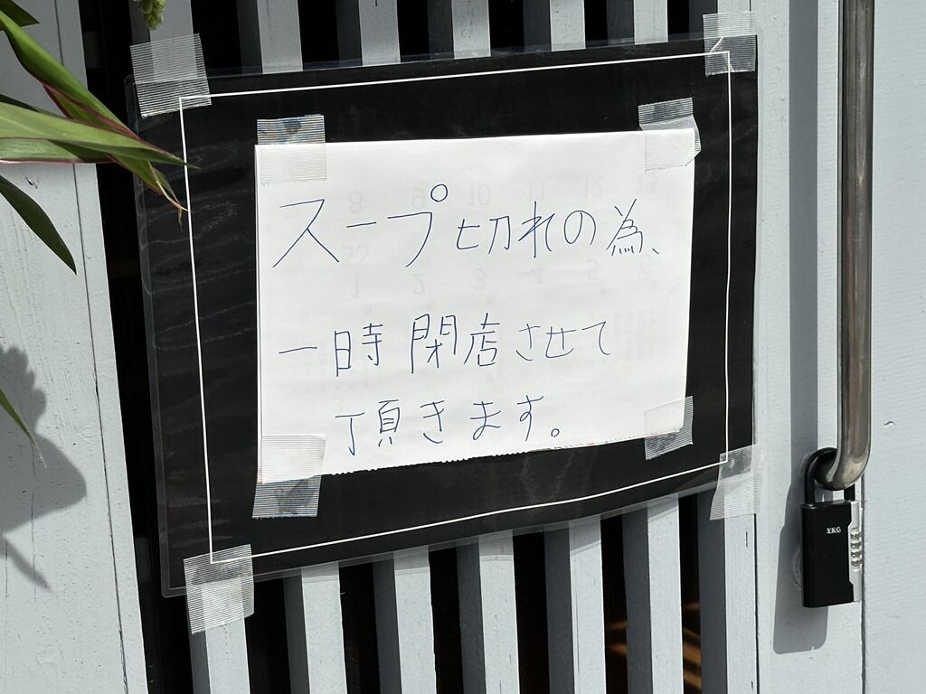 14:00頃到着で先客3、後客なし。というか、自分が入って程なくOPENの札が裏返しになってCLOSEに。スープ切れの掲示も。というわけで、期せずして本日昼の部ラス客に。