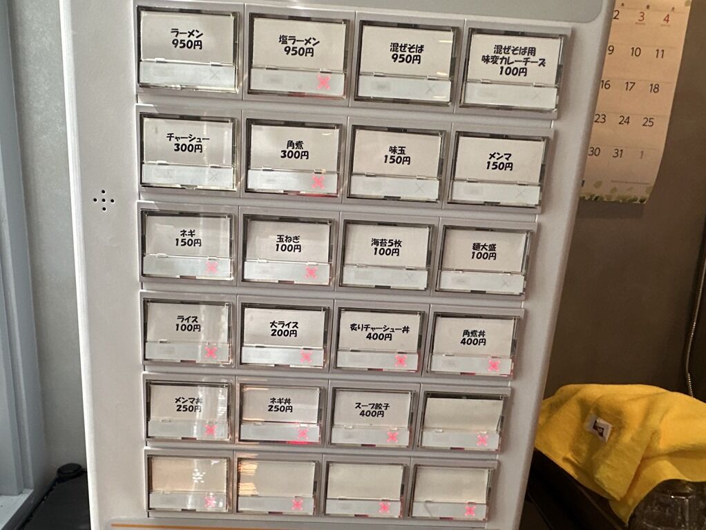 入店するとまず券売機で食券購入です。主なメニューはラーメン・塩ラーメン950円、混ぜそば950円、炙りチャーシュー丼400円、角煮丼400円、他。訪店時ご飯類は売切れ。