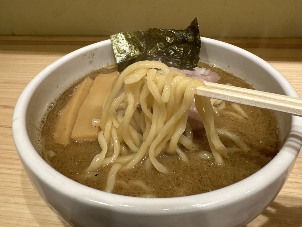 麺はカネジン食品製の中太縮れタイプ。もちもち食感で重量級のスープに負けていません。