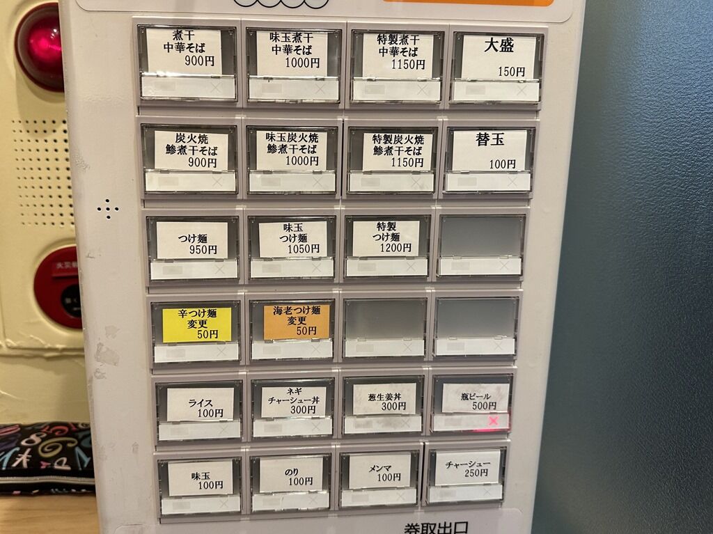 入店するとまず券売機で食券購入です。主なメニューは、煮干中華そば900円炭火焼鯵煮干し中華そば900円、つけ麺950円、辛つけ麺変更50円、海老つけ麺変更50円、他。