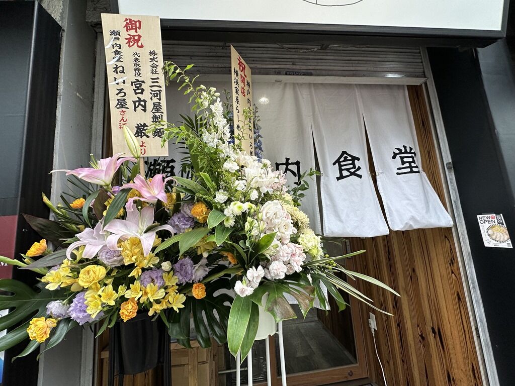 現在11:00〜24:00の通し営業。店頭開店祝花は三河屋製麺、横浜家系らーめん侍、他から。