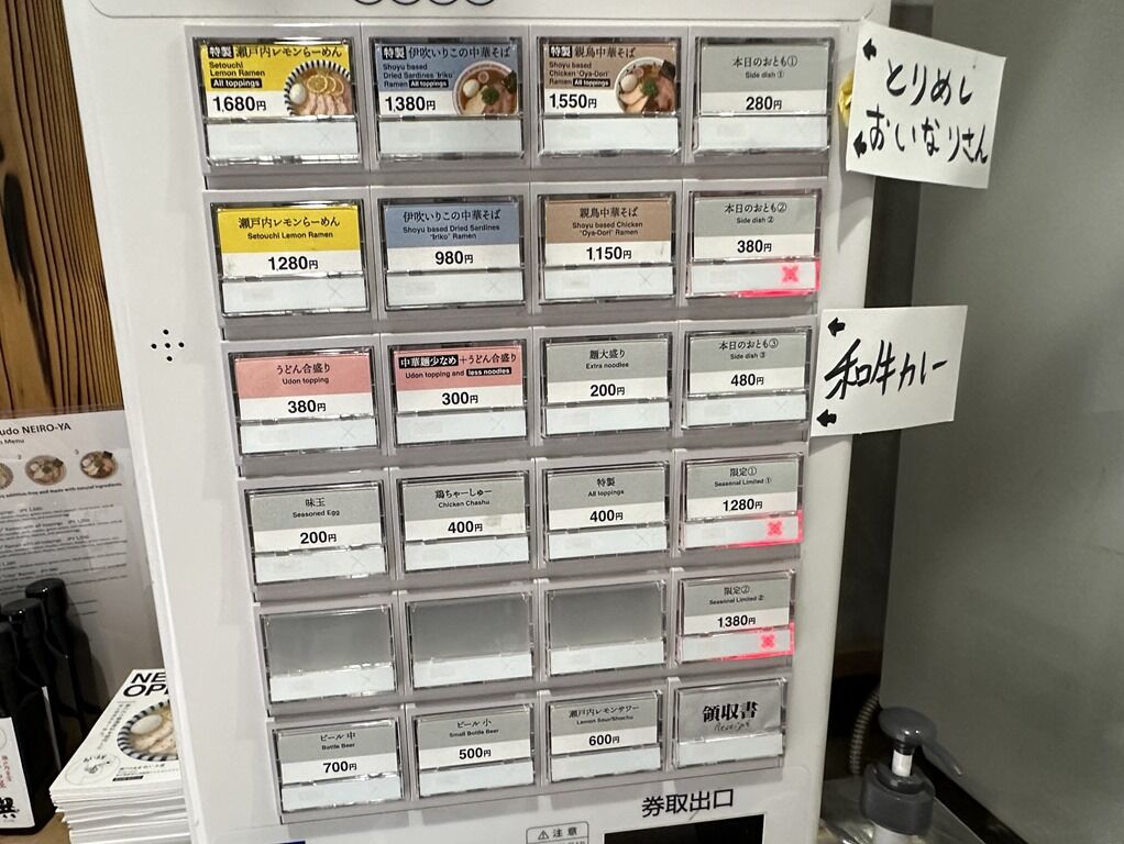 入店前にまず店頭券売機で食券購入です。主なメニューは、瀬戸内レモンらーめん1280円、伊吹いりこの中華そば980円、親鳥中華そば1150円、中華麺少なめ+うどん合盛り300円、本日のおとも①280円、本誌のおとも③480円、他。