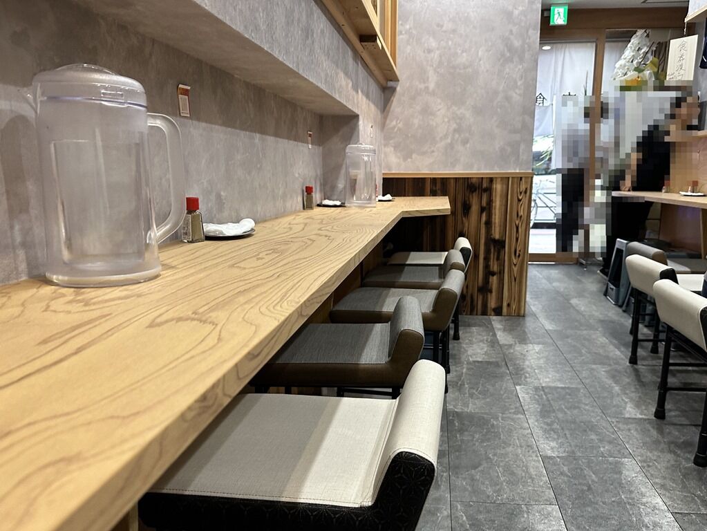 奥に細長い店内は厨房を囲むL字型カウンター7席(6・1)、壁に向かったカウンター7席。