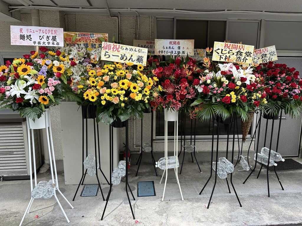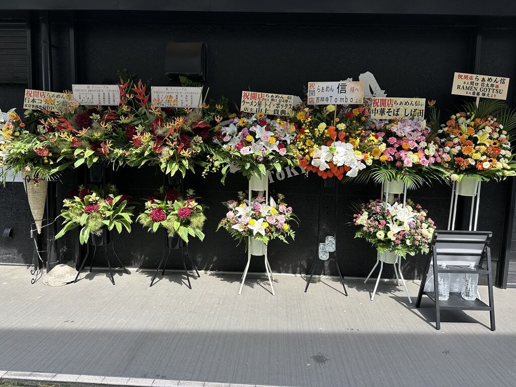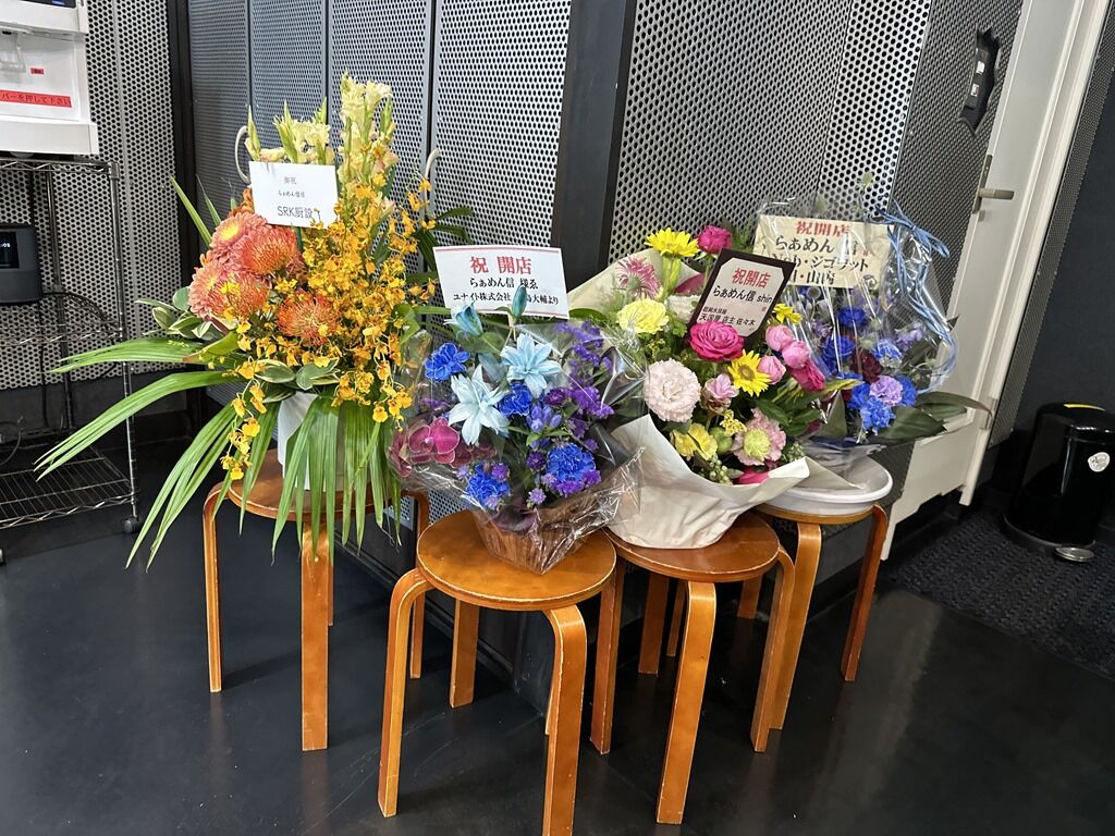 敷地内にとてつもない数の開店祝花。気づいたところでは、飯田商店、支那そばや、せたが屋、佐野JAPAN(ドゥエイタリアン、胡心房、麺や維新、一番いちばん、本枯れ中華そば魚雷、天下ご麺、カドヤ食堂、鶏喰~TRICK~、らぁ麺すぎ本)、ラーメン屋トイ・ボックス、吉祥寺Tombo、中華そばしば田、RAMEN GOTTSU、麺処びぎ屋、カドヤ食堂、らーめん藁、中華そば一清、くじら食堂、他から。