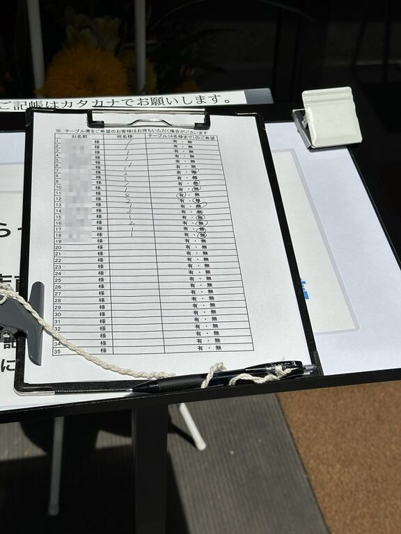 待機列が伸びて来たため予定より11分早く記帳開始。時間指定等は出来ず、名前と人数、テーブル希望有無を記載。