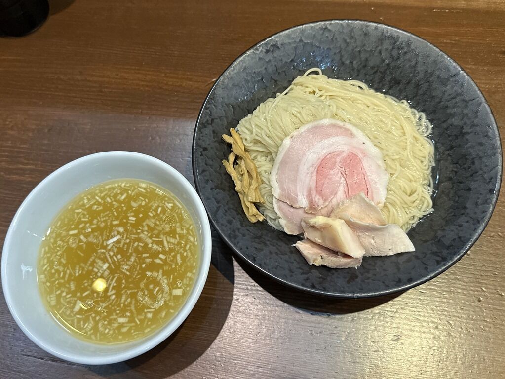 たっぷりの北海道産帆立貝柱と昆布で出汁をひいたつけ汁。麺には水塩を絡めてありまずは麺だけで、その後麺をつけ汁に浸けていただくのが推奨。うま味が存分に詰まったつけ汁に細麺がマッチ、麺がズバズバ進みます。