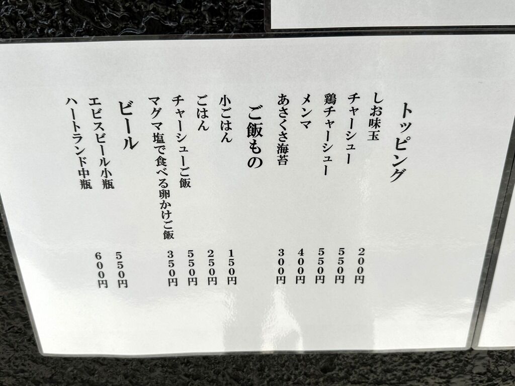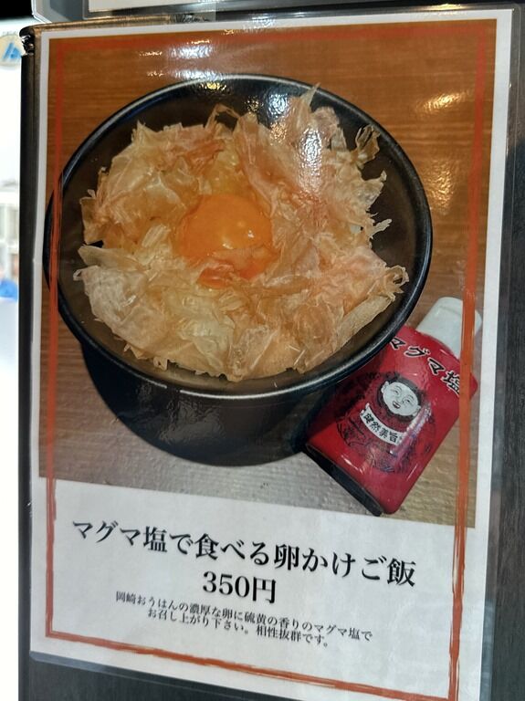 入店するとまず新紙幣対応券売機で食券購入です。主なメニューは、塩らぁめん1250円、塩つけ麺1500円、二色チャーシュ一ご飯550円、マグマ塩で食べる卵かけご飯350円、他。