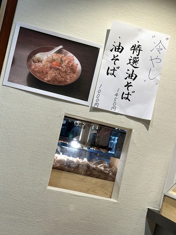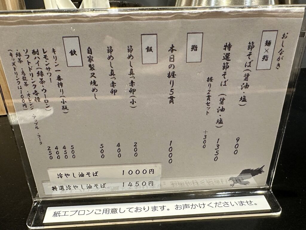 券売機は無く食後の席にて後会計制。主なメニューは節そば(醤油・塩)900円、冷やし油そば1000円、特選+450円、2貫セット+300円、本日の握り5貫1000円、節めし真っ赤玉小200円、自家製叉焼飯500円、他。