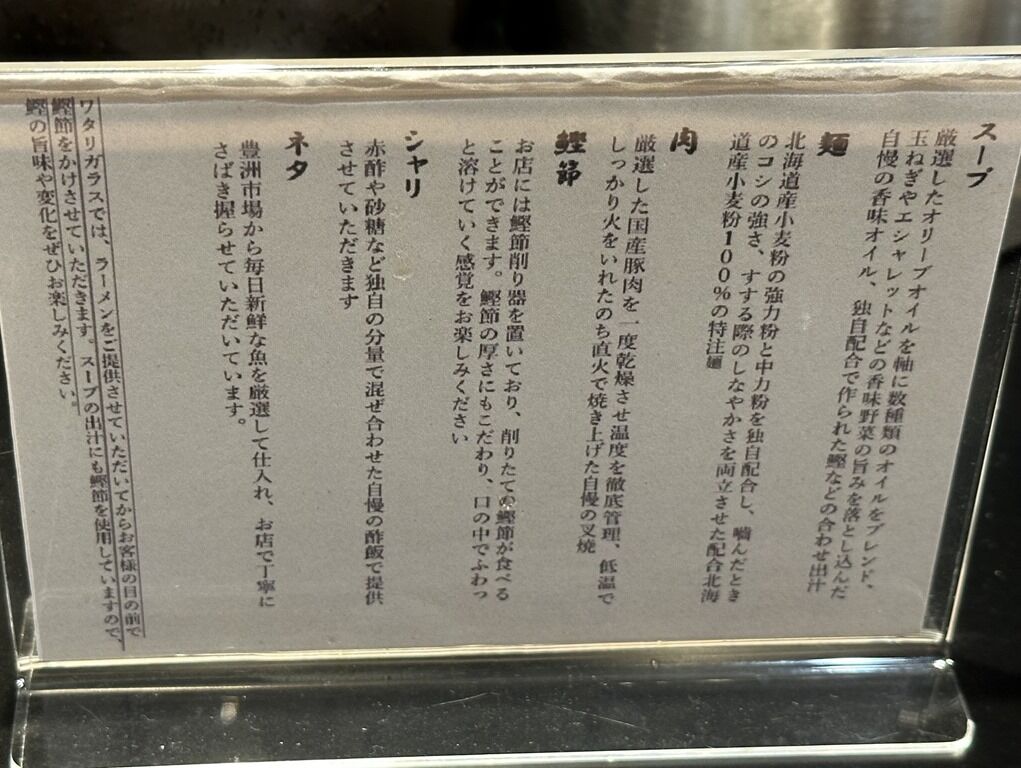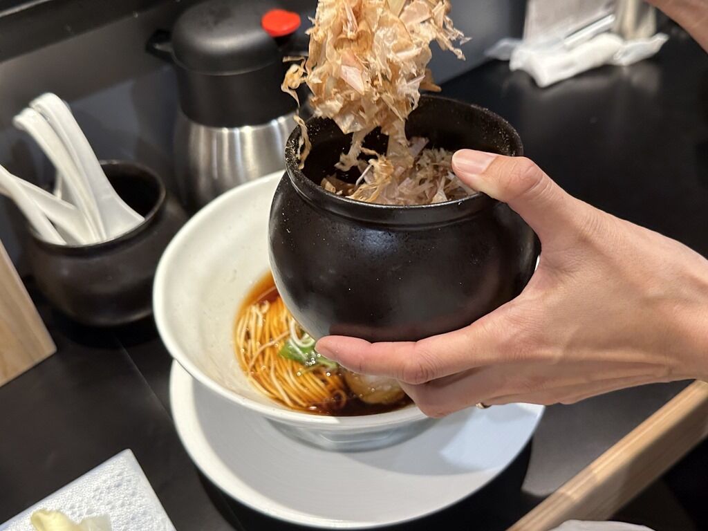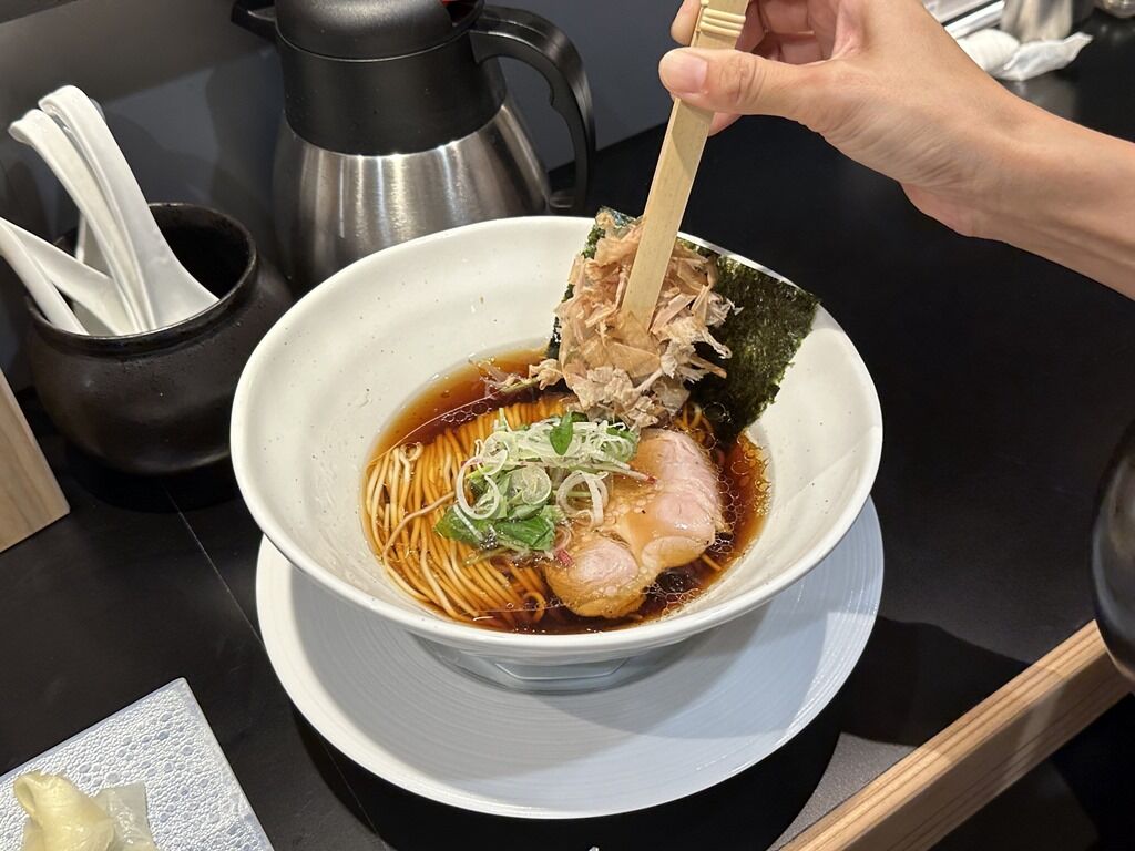 具は低温調理後直火で焼いたチャーシュー、きざみ青白ねぎ、海苔、目の前でトッピングした鰹節。