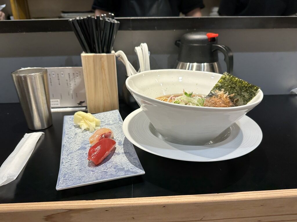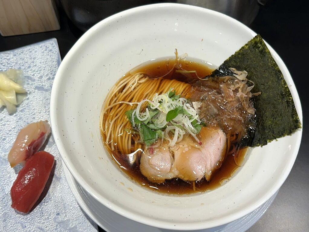 名店にして名プロデューサー八咫烏居山勢さんの元で修行した店主さんによるお店。女将さんは寿司屋の娘さんで、ラーメンと寿司のセットが楽しめます。