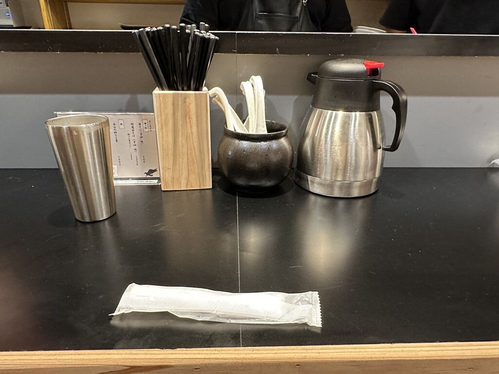 紙エプロンは申告制。BGMはニューウェーブ。箸は洗い箸でサスティナブルに配慮。卓上調味料は無し。