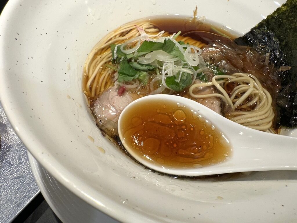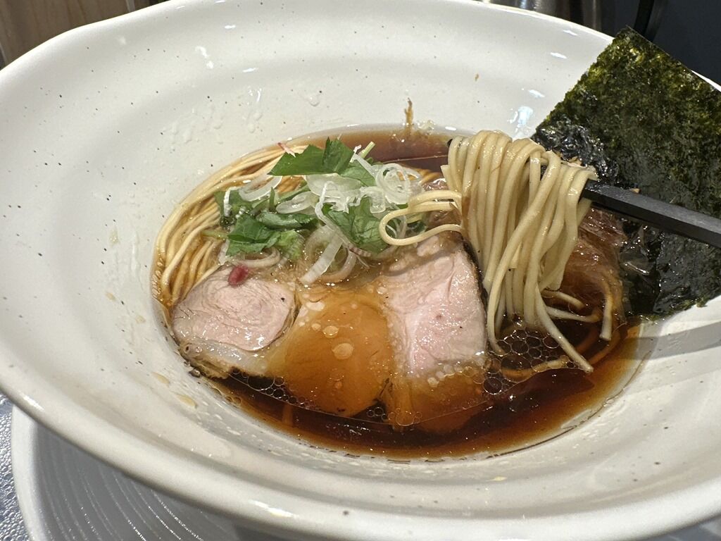 スープはさらさらの清湯醤油味。鰹出汁メインの和出汁に、オリーブオイル、玉ねぎ、エシャレットなどの香味野菜の旨みを溶かし込んだ香味油。スッキリしつつ深みのある旨みが広がるキレとコクが両立した味わい。いつもながら冴え渡る八咫烏直伝ファインチューンですごく美味しい!