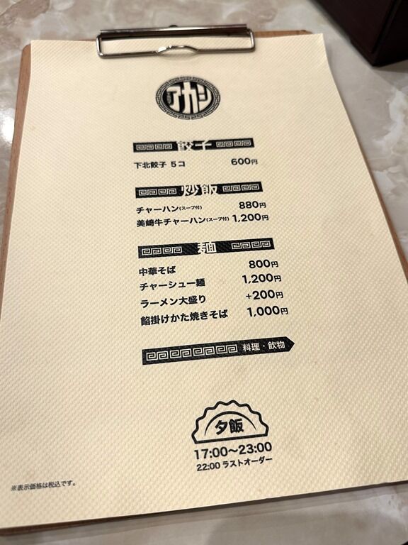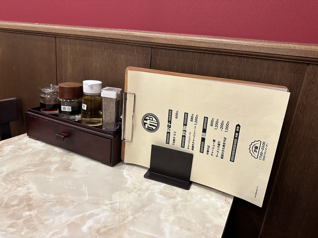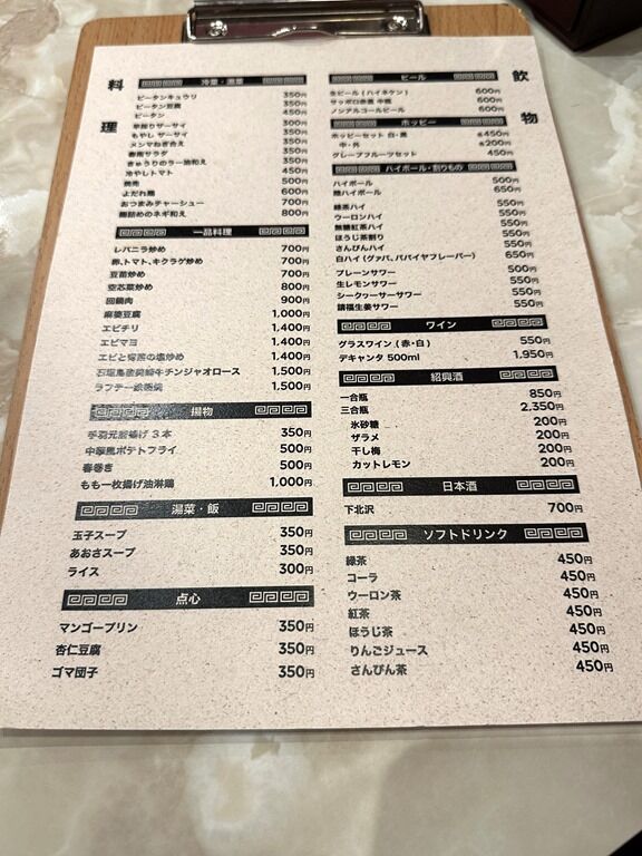 券売機は無く後会計制。主なメニューは中華そば800円、餡掛けかた焼きそば1000円、下北餃子5個600円、チャーハン880円、他、冷菜・温菜、一品料理、揚物、湯菜・飯、天津多数。ドリンクの種類もたっぷり。