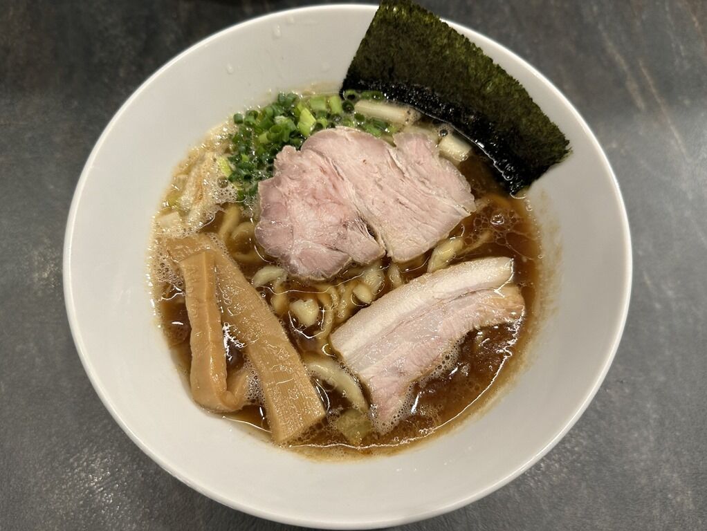 しらけんさんの「中華蕎麦」。器も塩と同じ。具も柚子皮の有無以外同じ。麺もおさ一緒。スープもタレ以外は同一とのこと。