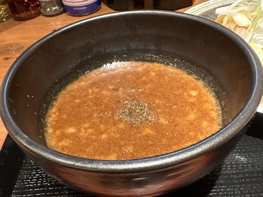 つけ汁はどろっと濃厚な煮干し白湯醤油味。鶏白湯スープに煮干し出汁を合わせた、濃厚煮干しとしてスタンダードなタイプ。煮干し香りませんが、旨みが強く太麺を食べさせるパワーは十分。全つけすると少ししょっぱいかも。