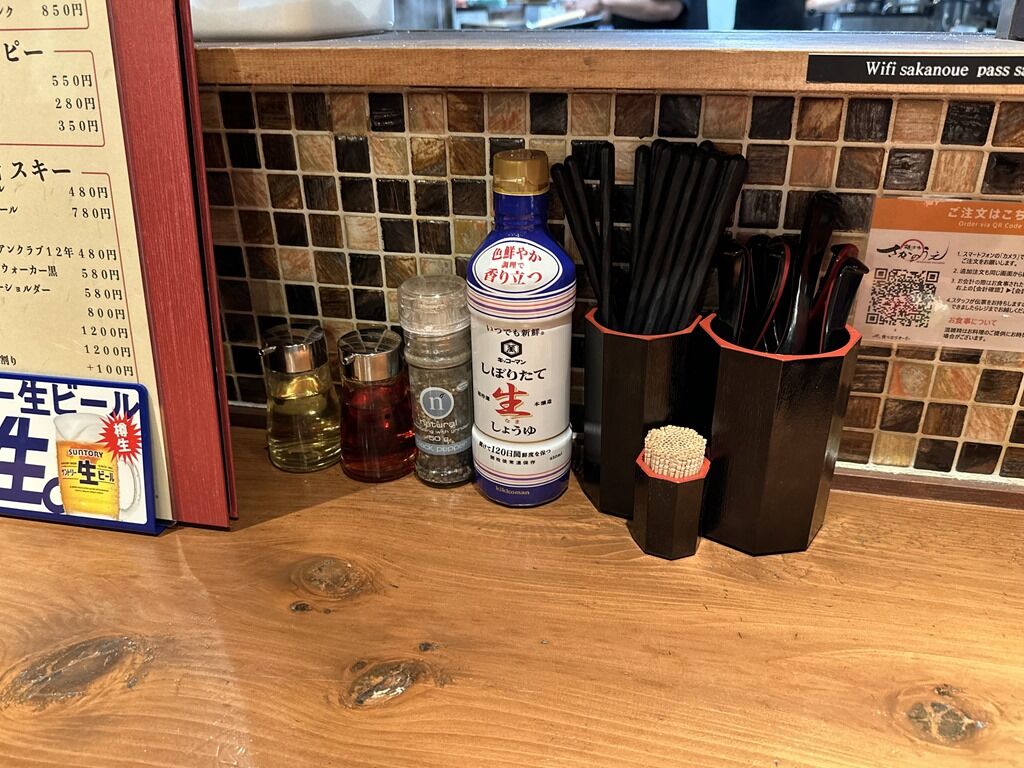 BGMはJ-POP、真夏の夜の夢、純愛ラプソディ、他♪箸は洗い箸でサスティナブルに配慮。卓上調味料は酢、ラー油、ペッパーミル入り粒黒胡椒、キッコーマンしぼりたて生しょうゆ。