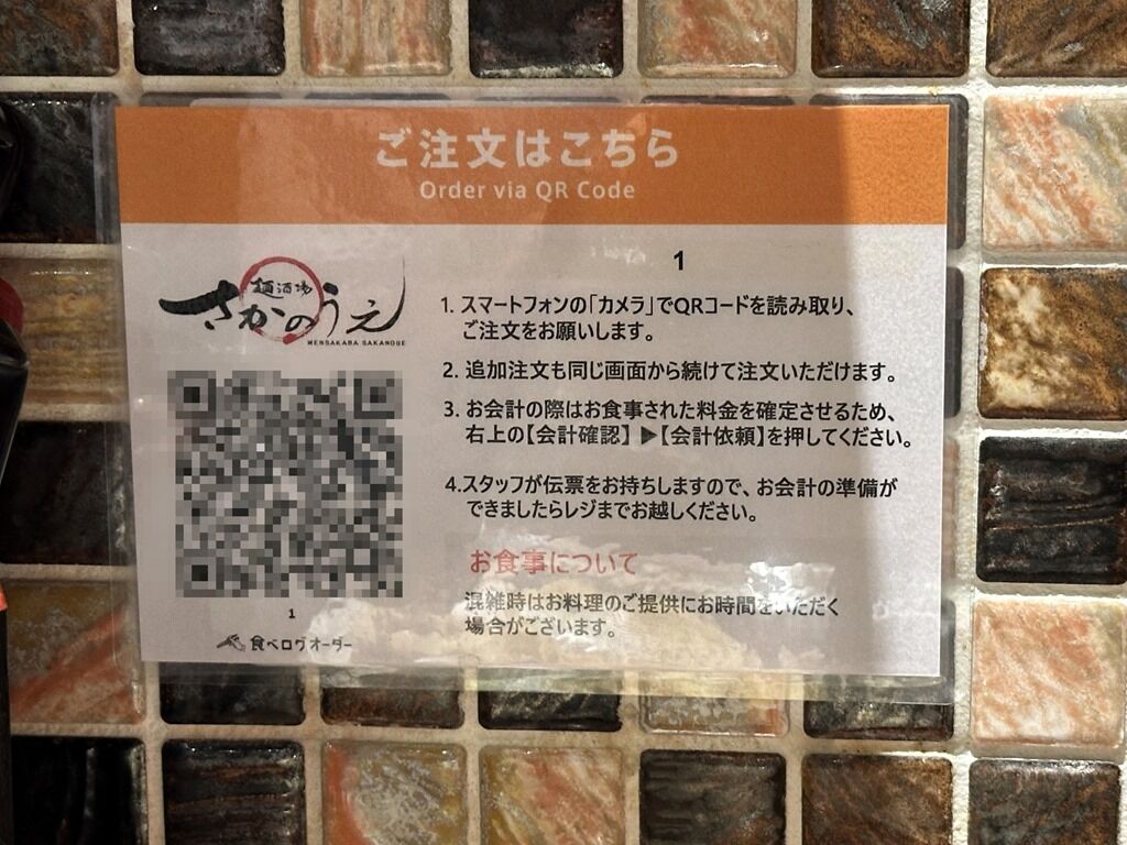 最初の一杯(1品)は口頭注文、2回目以降の注文はQRコードを読み込んでスマフォ注文、飲食後レジにて後会計制。