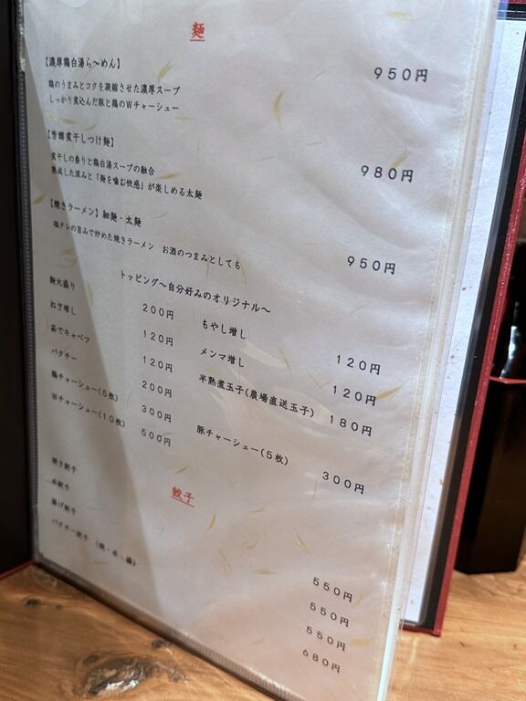麺メニューは、濃厚鶏白湯ら〜めん950円、芳醇煮干しつけ麺980円、焼きラーメン太麺・細麺950円。博多では定番ですが、都内で焼きラーメンがあるのは珍しい。