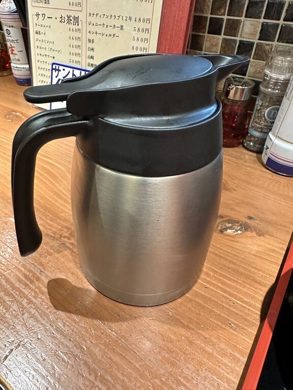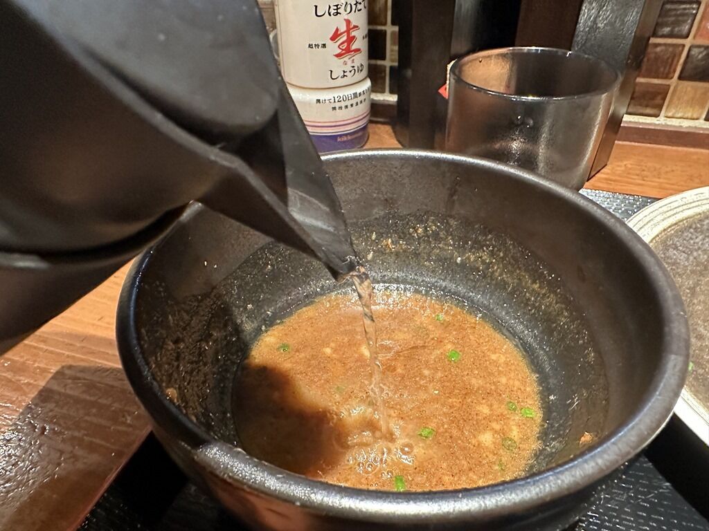 スープ割りをお願いすると、割りスープ入りポットが渡されます。割りスープは清湯の鰹出汁。割ると魚感がさらに強まって和風にシフトします。
