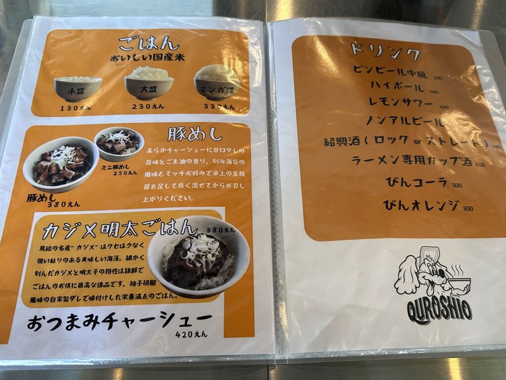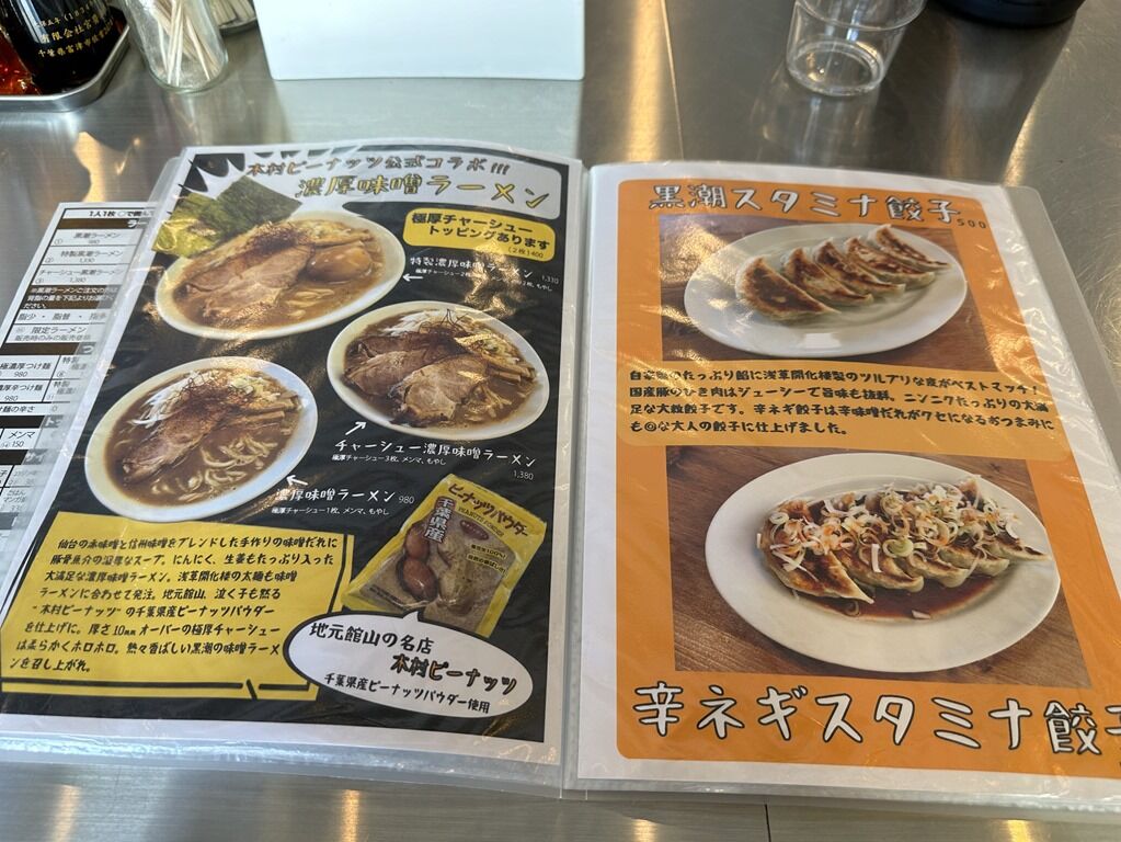 主なメニューは、黒潮ラーメン・極濃厚つけ麺・極濃厚辛つけ麺・濃厚味噌ラーメン 各980円、黒潮スタミナ餃子500円、カジメ明太ご飯380円、ミニ豚めし250円、他。