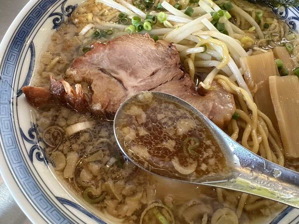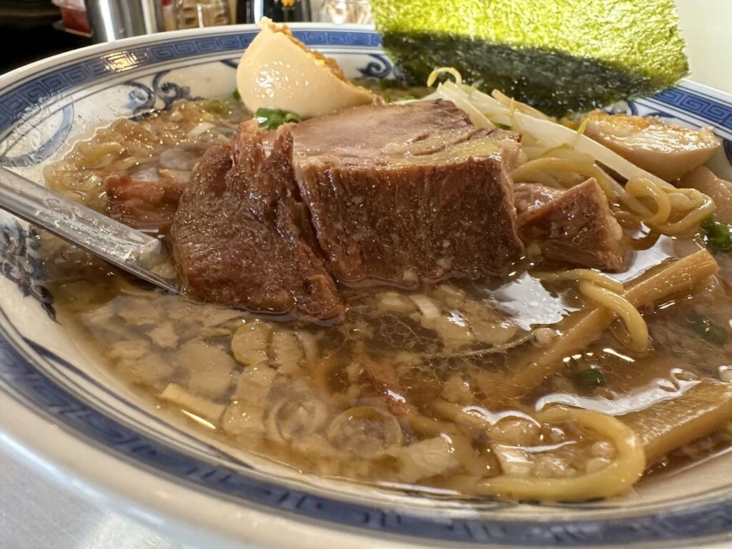 具はデカチャーシュー、板メンマ、もやし、味玉、きざみ青白ねぎ、海苔。チャーシューは厚さ10mmオーバの超極厚。分厚いですが箸で持つとホロリと崩れる柔らかさ。味玉どうもありがとうございます!気を遣っていただきすみませんm(_ _)m