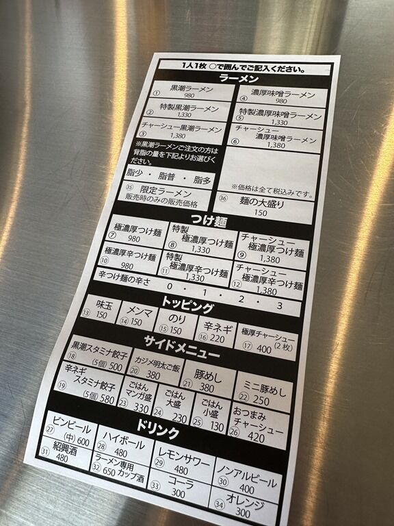 券売機はなく一人1枚オーダーシートを記入して注文。商品提供時と席番の番号札を渡され食後レジにて後会計制。