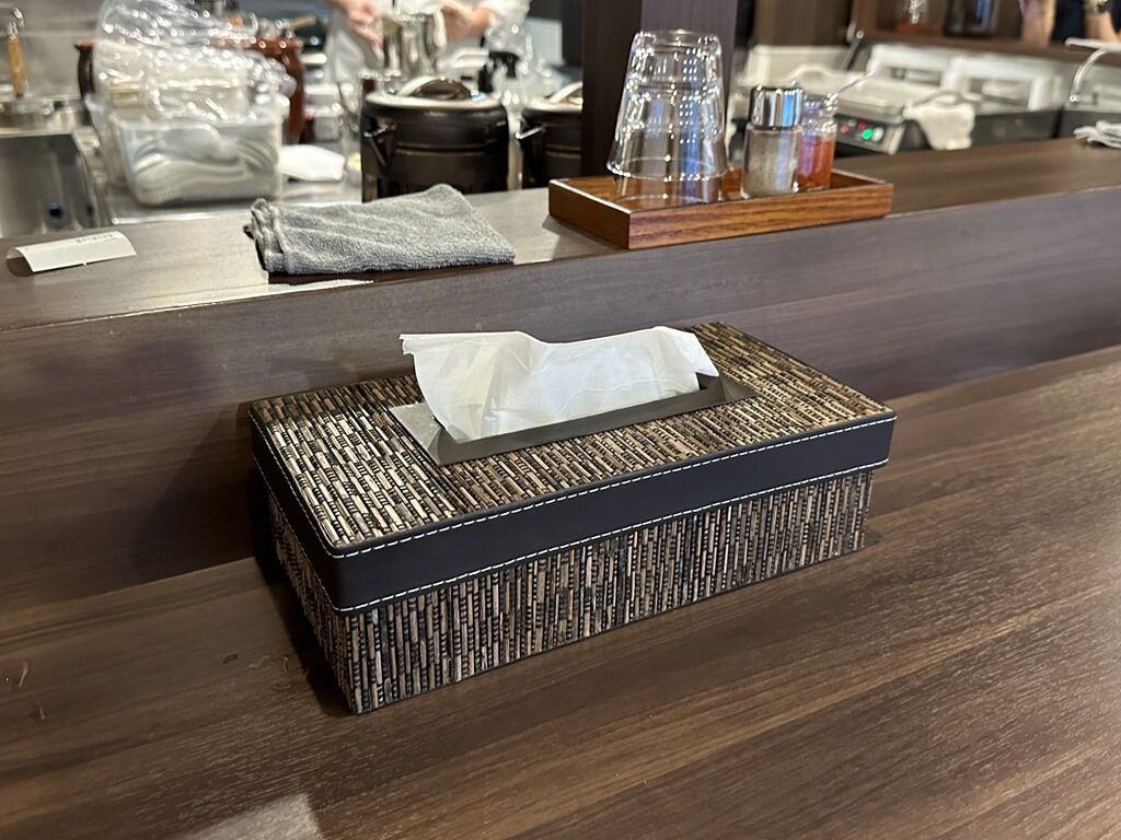 紙エプロン・ウエットティッシュは券売機横に用意。箸は割り箸。卓上調味料はブラックペッパー、豆板醤。