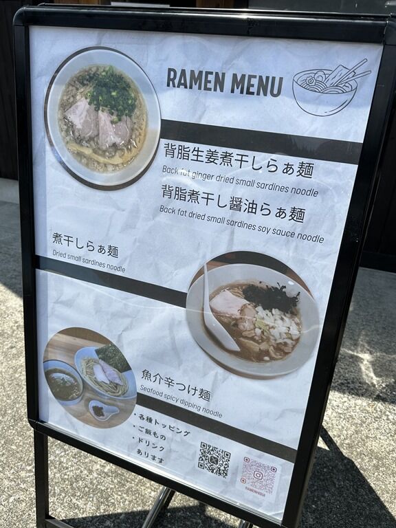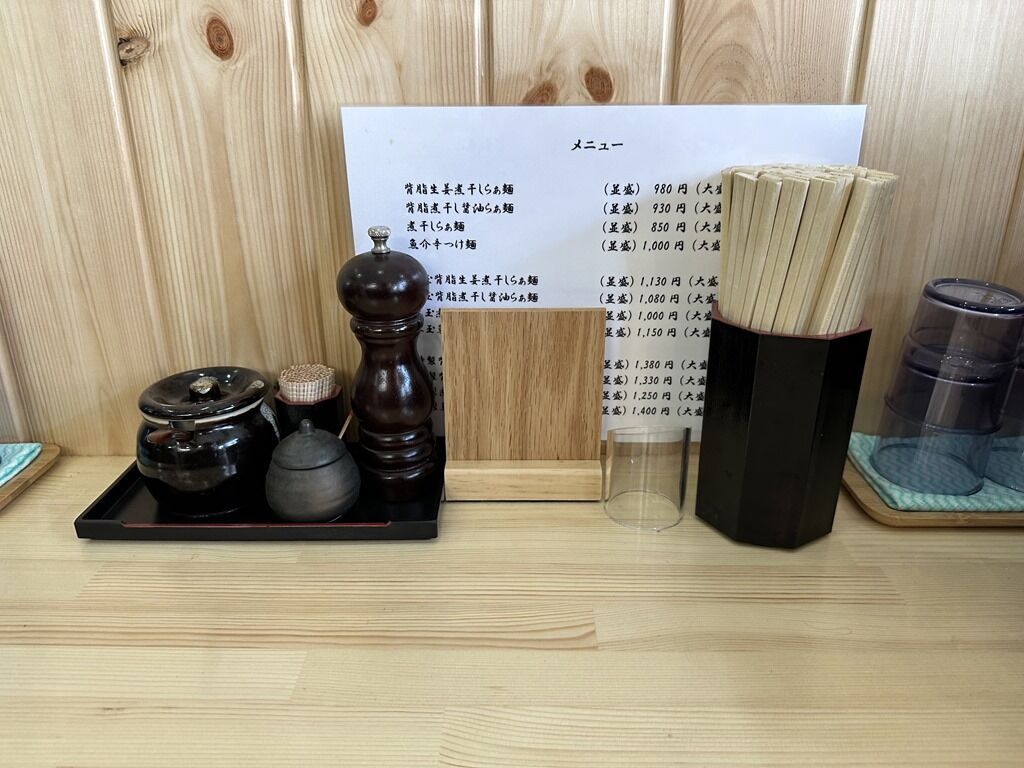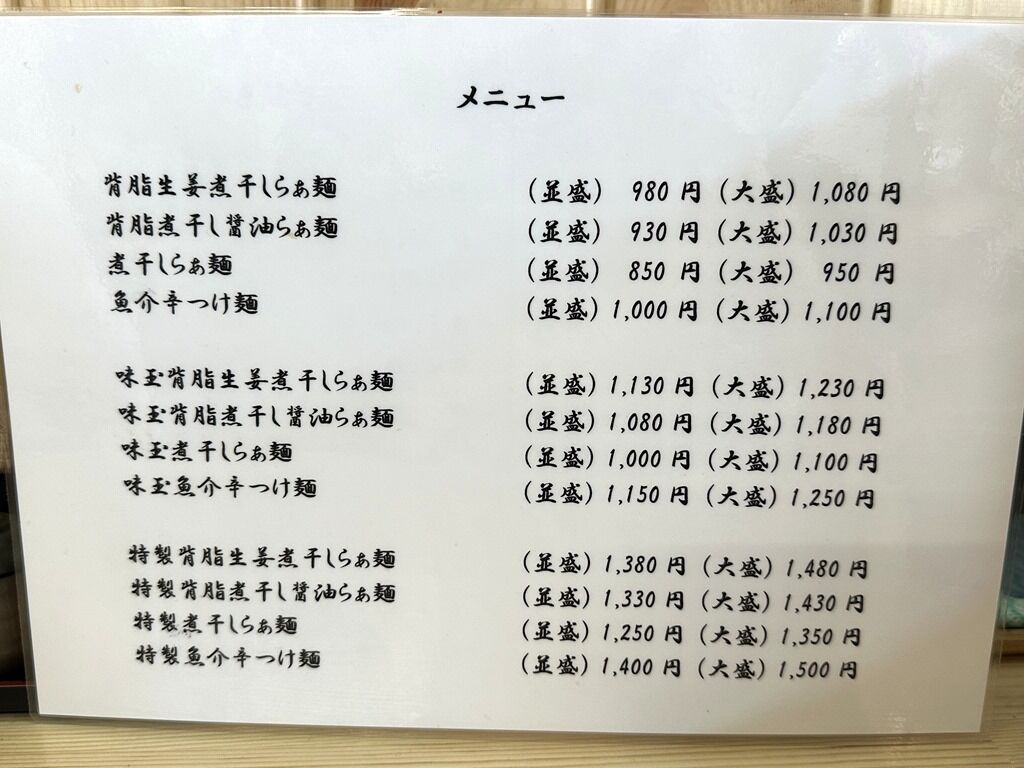 券売機は無くメニューを見て口頭注文、伝票方式、食後レジにて後会計制。主なメニューは、背脂生姜煮干しらぁ麺980円、背脂煮干し醤油らぁ麺930円、煮干しらぁ麺850円、魚介辛つけ麺1000円、TKG250円、煮干しご飯・葱塩ご飯各300円、賄いチャーシュー丼350円、他。