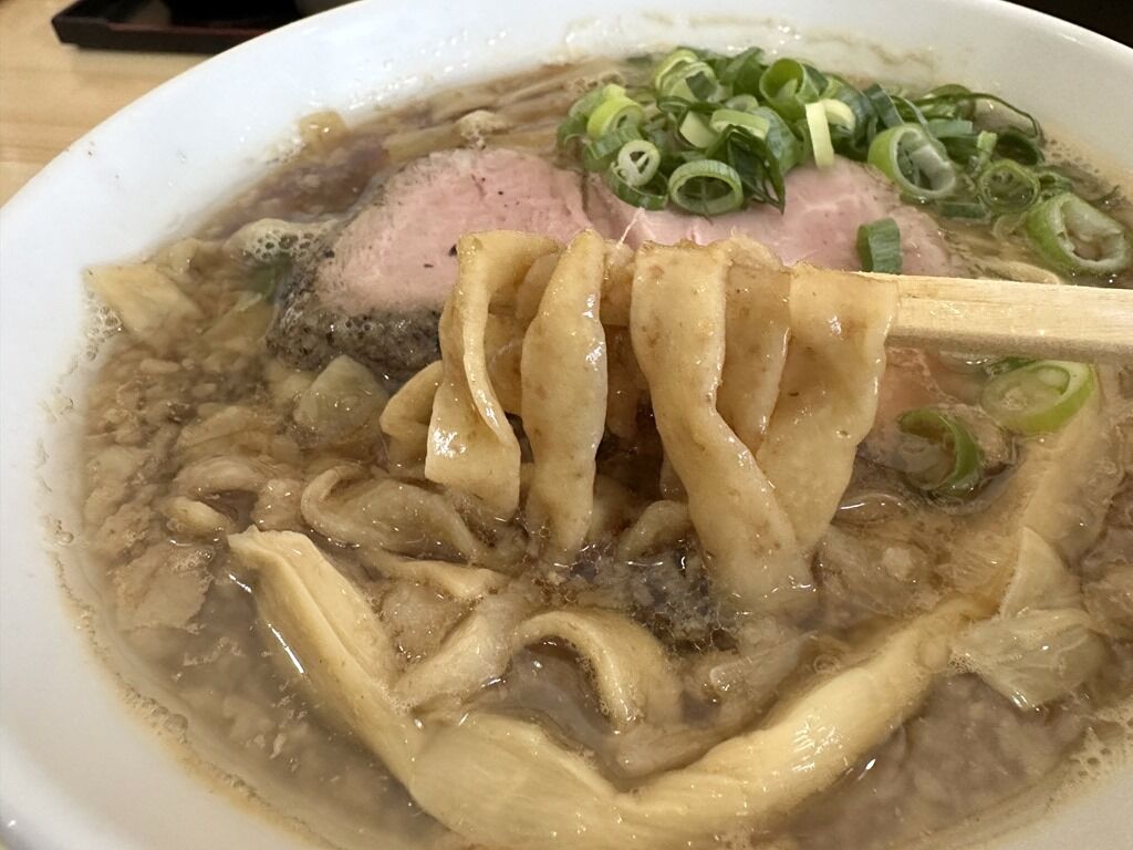 スープは大小の背脂がたっぷり浮いた生姜がガッツリと効いた煮干し醤油味。超熱々での提供。ベースの煮干スープに背脂+生姜でバリエーション化。生姜醤油と背脂煮干の融合で、長岡と燕三条