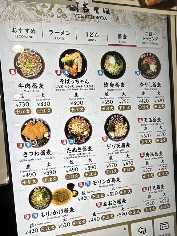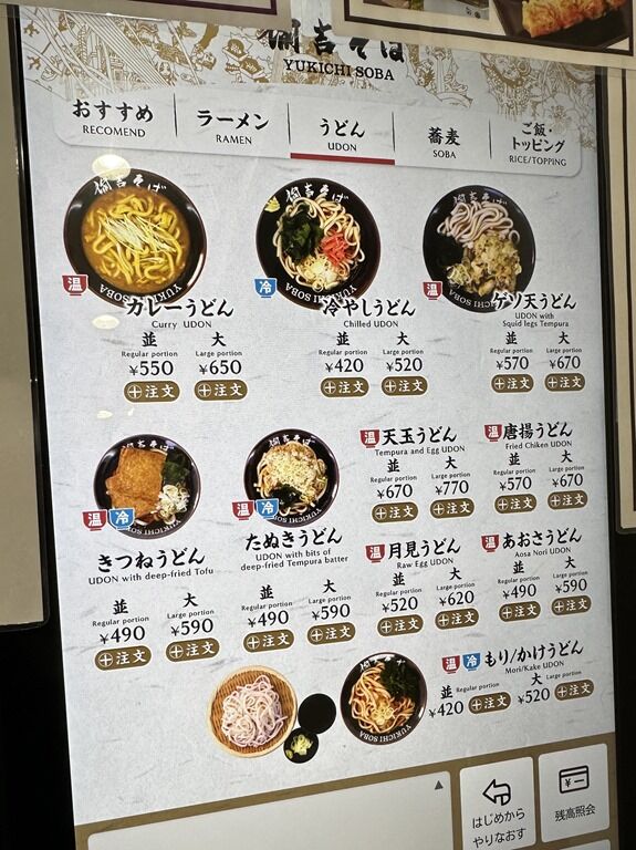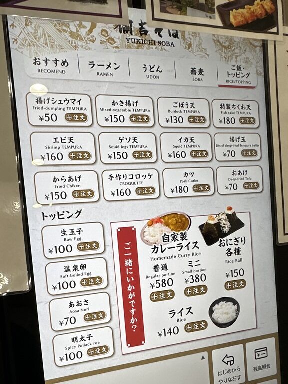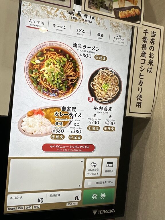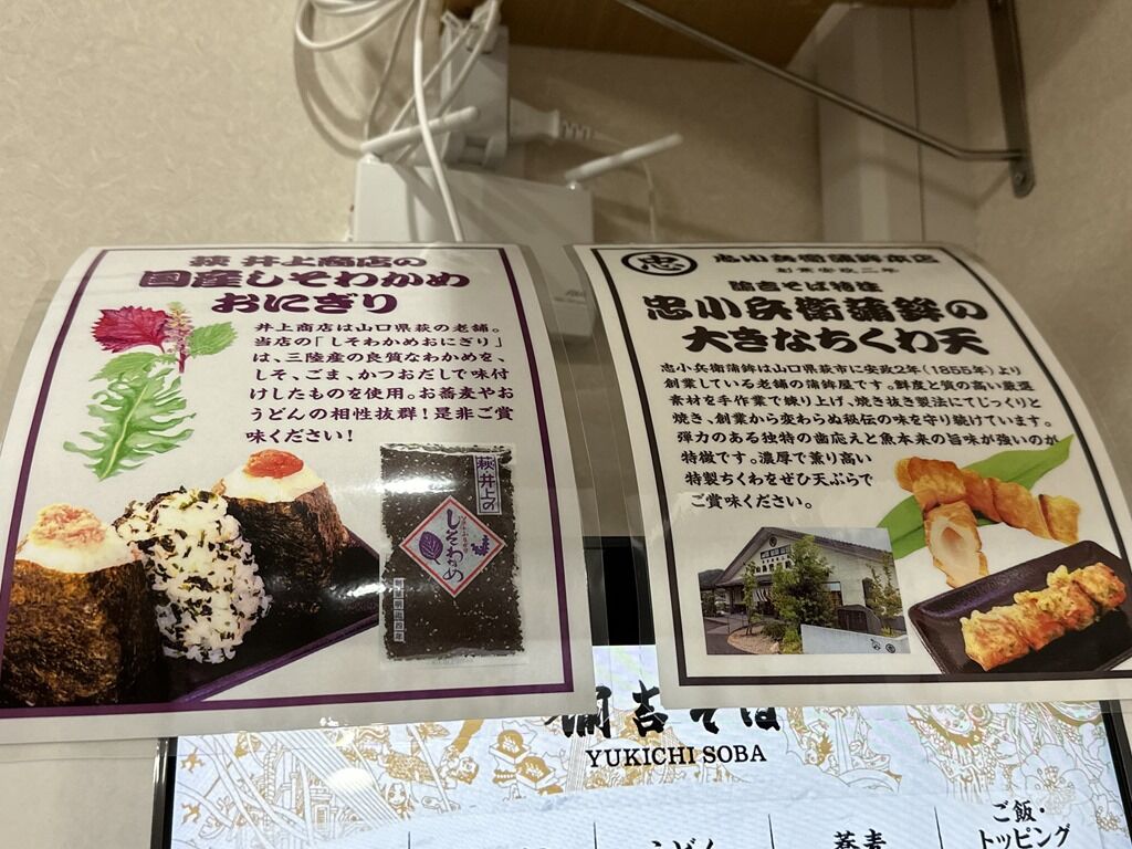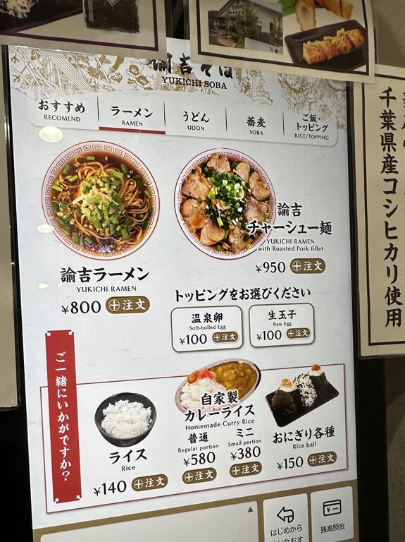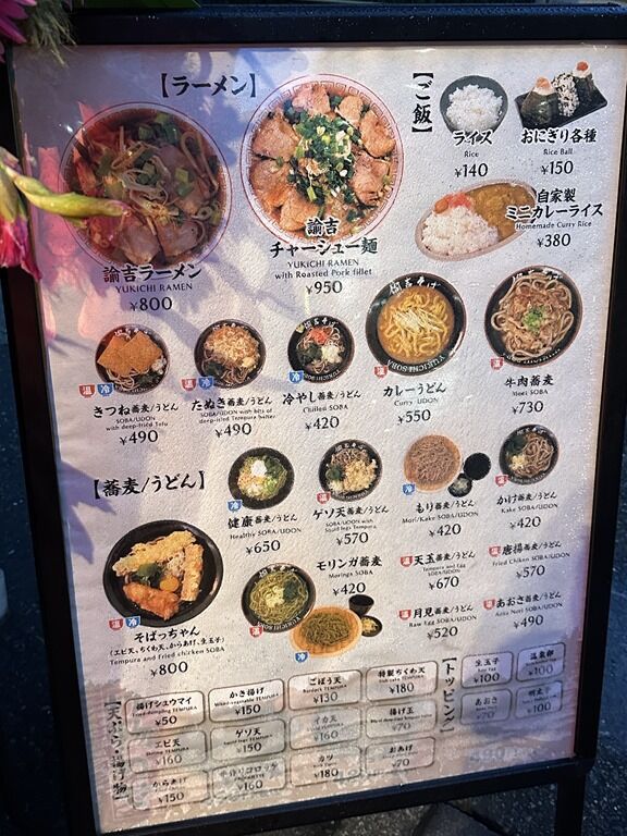 主なメニューは、諭吉ラーメン800円、諭吉チャーシューメン950円、自家製カレーライスミニ380円、カレーうどん並550円、ゲソ天うどん並570円、そばっちゃん並800円、ゲソ天蕎麦570円、他。