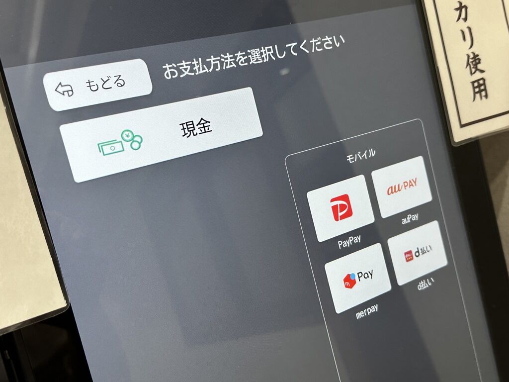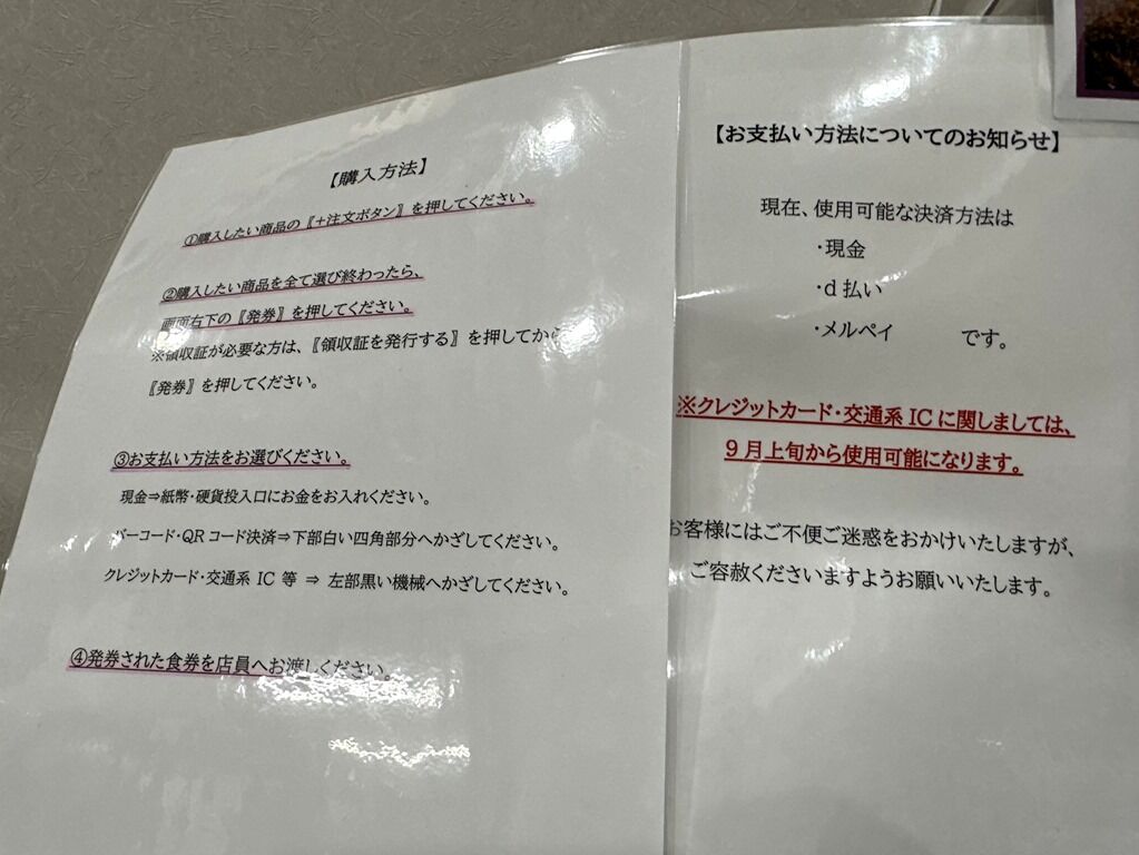 入店するとまずタッチパネル式券売機で食券購入です。決済方式は現金と一部キャッシュレスに対応。クレジットカード・交通系ICは9月上旬対応予定。