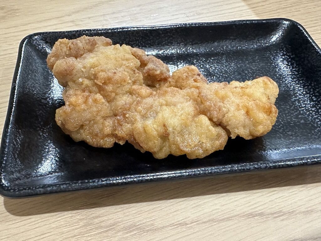 大将?から店内にいる4名にサービスですと提供された「からあげ」。でかっ!リニュアル前の蕎麦屋さんで弁当も販売していて、一番人気が「からがげ弁当」という、その「からあげ」。ちょっと冷たいですが柔らかくて美味!