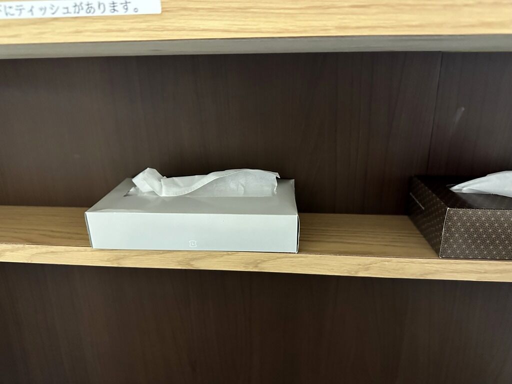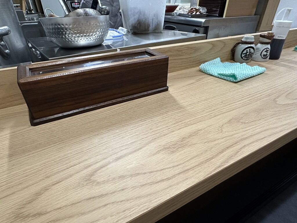 箱ティッシュはカウンター下。BGMは落語。箸は割り箸。卓上調味料は胡椒、七味唐辛子、天丼タレ。