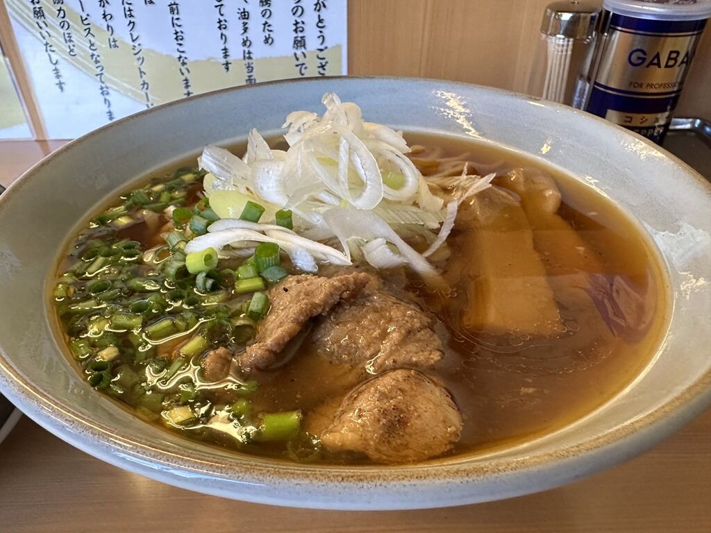 らーめんの具は、生姜焼きの肉、極太メンマ、笹切り白ねぎ、きざみ青ねぎ。