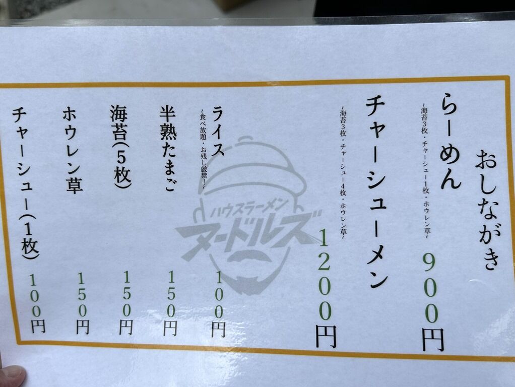 主なメニューはラーメン900円、チャーシューメン1200円、ライス100円、他。
