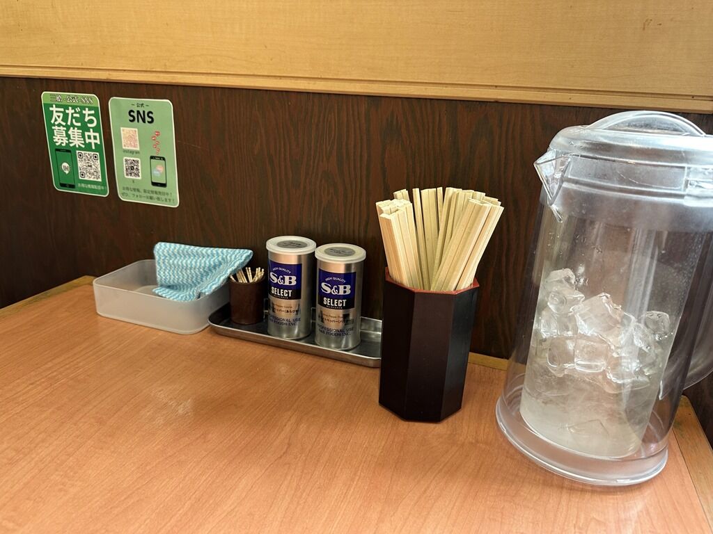BGMはJ-POP、Bling-Bang-Bang-Born、幾億光年、他♪箸は割り箸。卓上調味料はS&Bブラックペッパー・ホワイトペッパー。