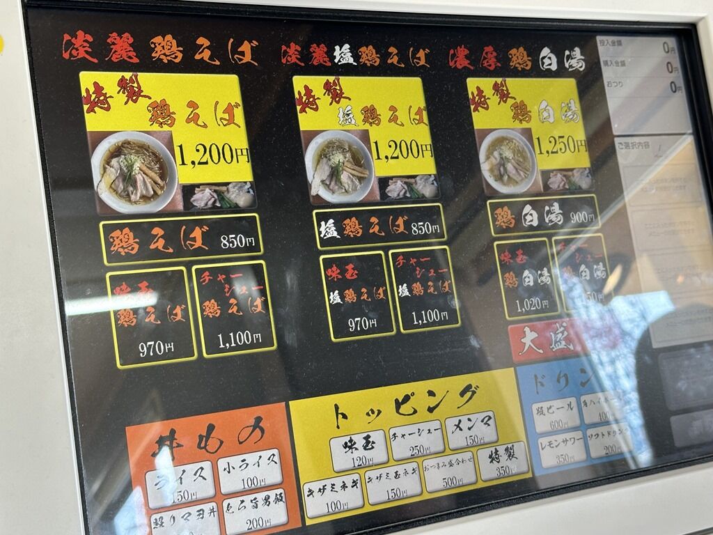 主なメニューは淡麗鶏そば(醤油・塩)850円、濃厚鶏白湯900円、とろ旨男飯・照りマヨ丼 各200円、他。とろ旨男飯または照りマヨ丼の食券購入後SNSフォロー画面を見せると、大人気サイドメニュー「麻婆丼」に変更可能。