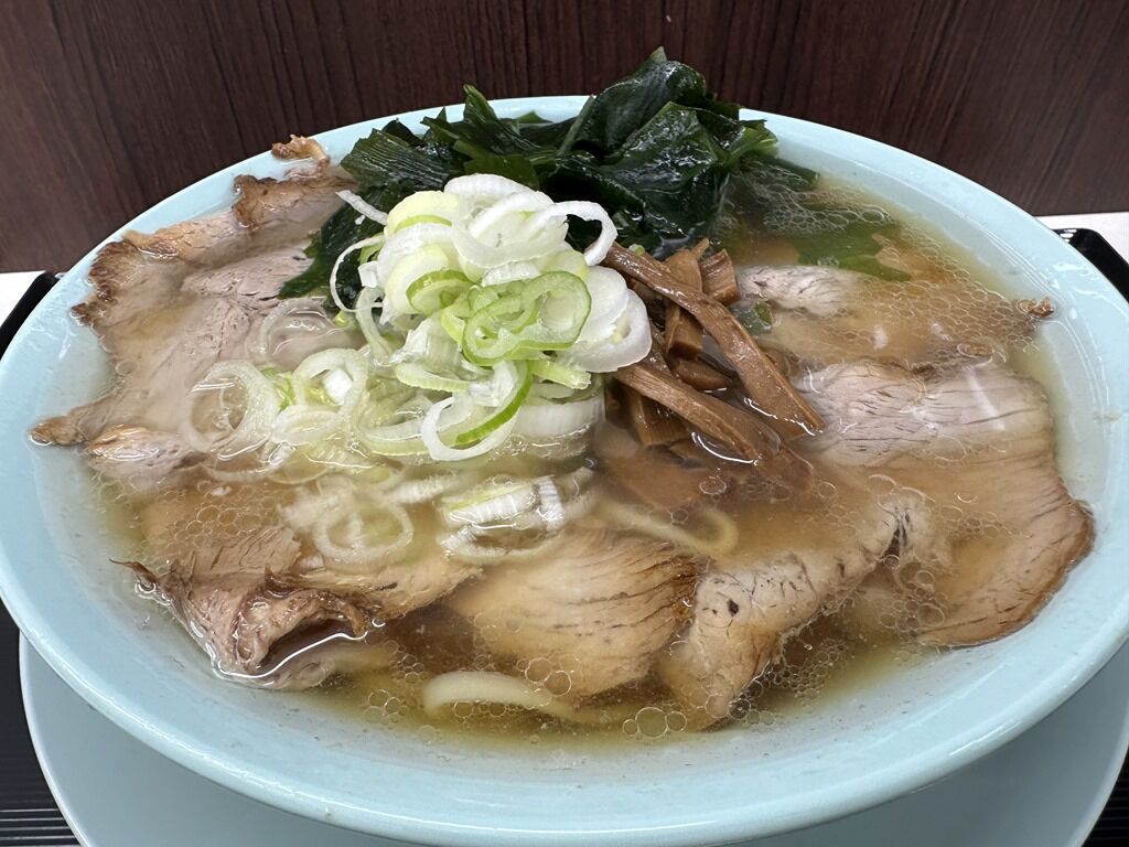 具は何度見てもびっくりな驚くほどたっぷりのチャーシュー、メンマ、どっさりのワカメ、小口切りねぎ。チャーシューは本当に電動スライサーでギュルンギュルン切った切り立て。