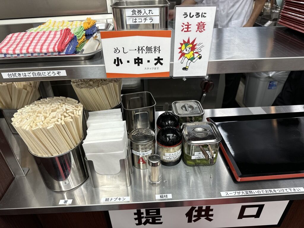 BGMはビートルズ。箸は割り箸。卓上調味料は無しですが、商品受取口と店内中央に、胡椒、おろしニンニク、青かっぱ。他に割り箸、レンゲ、紙ナプキン、紙エプロン、爪楊枝、ダスターも受取口に。