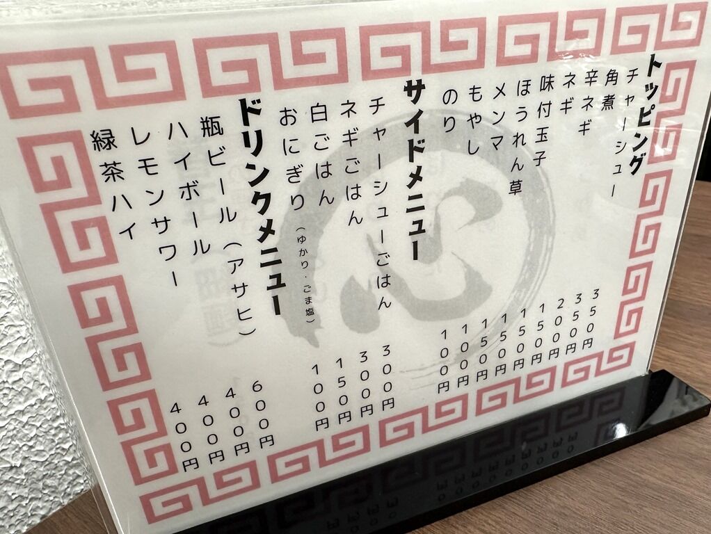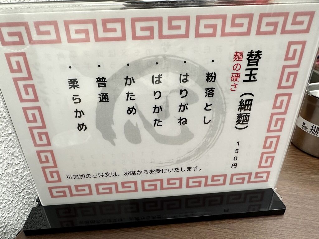 主なメニューは、太麺ラーメン・細麺ラーメン 各850円、つけ麺950円、太麺大盛り100円、細麺替玉150円、チャーシューご飯・ネギご飯 各300円、他。太麺・細麺が選べるのは出身店譲り。